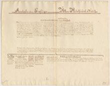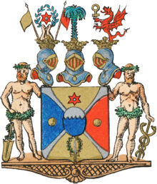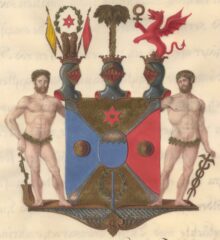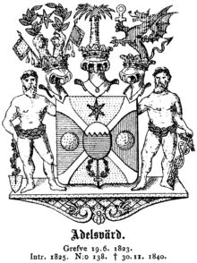 ”… En Fransk Skjöld, fyrstyckad genom ett åt ändarne utböjdt S:t Andreæ Korss af silfver, midtpå hvilket är fästad en liten oval blå hjert Skjöld med Sågskuren Chef af silfver. Den af Andreæ Korsset delade Skjöldens öfversta Fält är af gull, och deruti en sexuddig röd Molette. högra Fältet är blått, men det vänstra rödt, och i hvardera af dem en gyllene kula. Nedersta Fältet är åter af gull, med ett uprätt stäldt, tvääggadt blått Svärd, stuckit igenom en grön Lagerkrans. På Skölden hvila Trenne med Grefveliga kronor betäckta öppna Tornerhjelmar, ur den medlersta af hvilka upreser sig ett grönskande Palmträd. Den högra deremot bär Ättens urgamla hjelmprydnad: tvänne upsträckta Lejon-ramar af gull, som hålla en grön Lagerkrans, inom hvilken sväfvar en röd sexuddig Molette, varandes de omgifne till höger af en gul och till venster af en röd Standar, bägge med förgylda stänger samt gyllene fransar och toffsar. Ur venstra hjelmkronan upreser sig en till höger vänd röd Drake med utsträckta bakåt slagna vingar och upböjd stjert, förande i högra klon ett Koppar-Metallens tecken af gull. Skjölden hålles af tvänne Willmän, på hufvudet betäckte med Eklöfs kransar och omkring lifvet omgifne med Eklöfs-Gördlar; den högra stödjande sig med högra handen på en Åkerspade af gull, hvars skaft är tre gånger omvefvadt med en gren af grönskande Lager: den vänstra åter hållande vänstra handen på en gyllene Mercurii-Staf: Ståendes de tillika med Skölden på en ornerad Fotställning af gull. Aldeles som detta Wapen här frammanföre med sina rätta och egenteliga Färger afmåladt finnes.”