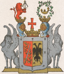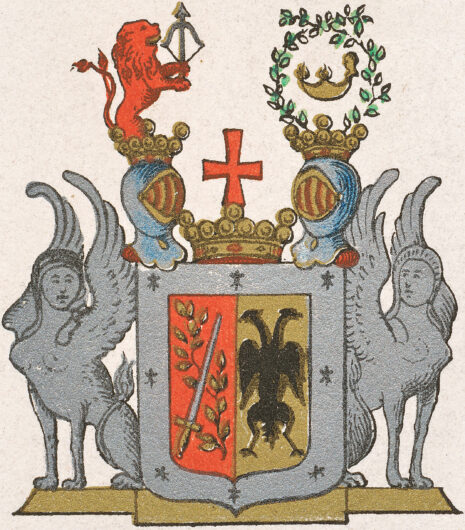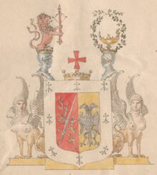 ”… En i twå lika delar klufwen Sköld, omgifwen med en bred Ram af silfwer, hwiken är belagd med Åtta swarta Hermeliner. Uti Sköldens högra Fält, som är rödt, ligga korsswis upåt wände ett Gyllene Swärd, med klinga af silfwer, och en gyllene Lagerqwist. I det wänstra Fältet af Gull, är en twåhöfdad Örn med utbredda wingar, af swart färg. Ofwanpå Skölden ligger en Friherre krona emellan twänne öpna Torner Hjelmar, med dylika kronor prydda. På den medlersta Friherre kronan är uprest ett rödt korss. Uppå den högra Hjelmen upstiger til litet öfwer hälften, ett til wänster wändt rödt Lejon, med öppet gap, utsträckt tunga af Gull, samt upåt slängd swans, hållande med båda fötterna en upspänd röd Båge med pålagd Pil af silfwer. På den wänstra Hjelmen böjas twänne Rankor af Murgrön, i form af en Krans, omfattande en brinnande gyllene Lampa. Skölden stödjes, på hwardera sidan, af en antique Sphinx, med upsträckta wingar, stående på Fotställningen: aldeles som det med sina rätta och egentliga färgor här afmåladt finnes.”