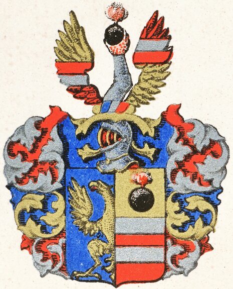 ”. . . En Skiöld i längden fördelt i twänne lijka delar, warandes det högre fältet blÃ¥tt, med en i längden half afskuren förgylter Örn uti, det wänstra fältet är i twären fördelt, uti hwars öfre dehl som är af gull, sees en swart brinnande Granat, och öfwer den nedre röda delen ligga twänne Bielckar af silfwer. Ofwan pÃ¥ Skiölden stÃ¥r en öppen Tornerhielm, utur hwilcken sträcker sig en bewäpnad Arm, som hÃ¥ller med handen en äfwen slijk Granat, emellan twänne utslagne, med gull och rödt hwar om annan fördehlte, wingar, och uti hwardera röda dehlen wisar sig en försilfrad Bielcke. Crantzen och Löfwärcket är af gull, silfwer, blÃ¥tt och rött, som detta Wapn med sina färgor här hoos afmÃ¥lat finnes.”