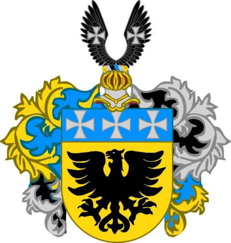 ”… Een Swart Örn med uthsträckte wingar i gull fällt, och deröfwer een blå chef, hwaruthi stå Twenne Kårβ af Sölfwer; ofwan på Skiölden står een öppen Tornerhielm hwaruthur opstijga ett pahr swarta wingar, hwardera medd ett sölfwer Kårβ Zijrade, Krantzen och Lööfwärket är af Gull, Sölfwer, blått och swart, aldehles som detta wapnet med des rätta och egenteliga färgor här hoos står repræsenterat och afmåhlat.”