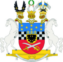 ”… En twå gånger delad Sköld, i hwars öfwersta fält, som är blått, glindra åtta gyllene Stjernor, tre, twå och tre satte. Det medlersta fältet består af trenne rader schackrutor, wexelwis af silfwer och swart färg samt är på midten betäckt med Hjertskölden, som har en blå chef, belagd med trenne gyllene kors, samt i nedra fältet, hwilket är af guld, en swart, med hufwudet till höger wänd, utsträckt Örn, med utbredda wingar. I Grefliga sköldens nedersta fält, som är rödt, skådas ett swärd och en sabel korswis lagde, begge försedde med gyllene fästen och klingor af silfwer. Uppå skölden hwila trenne öppna Tornerhjelmar, hwardera med Grefwelig krona betäckt. Ur den medlersta uppresa sig twenne stålkädda armar, hållande en Lagerkrans. Ifrån den högra uppstå twenne swarta wingar, märkte med hwar sitt gyllene kors. På den wenstra åter äro twenne jernkanoner i kors lagde och ofwan dem uppreste twenne hwita fanor och twenne blå standarer med gyllene fransar, tofsar och stänger samt emellan dem en blå Commando-staf, hwars öfra och nedra ändar äro af guld. Skölden stödes å ömse sidor af en hwit sig tillbakaseende och på bakfötterna stående Häst. Fotställningen är af guld samt deruppå fästad en sedel med walspråket: secundis dubiisque rectus; Alldeles såsom Wapnet här ofwan med sina rätta och egentliga färger afmåladt finnes.”