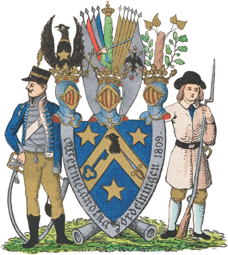 ”… En hjertformig blå Sköld, hvaruti ses en Sparre af guld, som med sin Spetts går intill öfversta kanten af Skölden samt beledsagas af trenne femuddige Stjernor af guld, en i hvardera af Sköldens öfra hörn och en nedemot dess Spetts. Sparren är belagd på spettsen med ett svart till höger vändt Örnehufvud och på högra benan med en blå Nyckel samt på den vänstra med ett blått Svärd. Skölden är på sidorne omgifven af en ram af Silfver, på hvilken med Svarta Bokstäfver finnes tecknadt Wermländska Fördelningen 1809. Uppå skölden äro Trenne med Gyllene Grefve Kronor prydda öppna Torner Hjelmar. Ifrån den medlersta Hjelmen upreser sig en grönklädd Arm med Svart uppslag, hållande i handen en Jägare Studsare. Bakom och bredevid Armen finnes till Höger upreste fyra och till vänster Sex stycken fanor, föreställande de serskildta Regementers fanor, som utgjorde den Wermländska fördelningen, af hvilka den till höger ytterst ställda och synliga är hvit och prydd med tvänne i Korss lagde gyllene Pilar samt föreställer Dal Regementets, och den till venster ytterst ställda synliga äfvenledes hvit och prydd med en uppå tvänne i Korss lagde gyllene pilar, utsträckt Svart Örn samt fyra Rosor af guld; och föreställer Nerike och Wermlands Regementes fana. Bakom Armen, midt emellan fanorne upreser sig ett grönskande poppel Träd, hvars Spetts bär en Kongl: Krona af Guld. Utur den till höger ställda Hjelmen upflyger halfdelen af en Svart och med Hufvudet åt höger vänd Örn, med utsräckta vingar, omgifven om halsen med en gyllene Ring och på bröstet tecknad men en femuddig Stjerna af guld. Uppå den på vänstra sidan stående Hjelmen synes, emellan tvänne upreste gröna Eklöfs grenar, af hvilka den högra bär två och den vänstra tre Ållon, en med roten ned åt vänd Lindestubbe, ofvantill försedd med fyra gyllene blad, hvilken utgör en del af Adeliga Ätten Lindroths Wapen. Skölden understödjes till höger af en i full mondering klädd Husar, hållande i högra handen en blottad och åt marken nedvänd Sabel samt till venster af en beväpnad Dalkarl, hållande i vänstra handen en Mousquet med påskrufvad Bajonet. Bakom Skölden äro ställde i korss tvänne Kanoner af Metall och hvilar altsammans på en uphöjd grön mark. Alldeles som det med sina rätta och egenteliga färgor här frammanföre afmåladt finnes.”