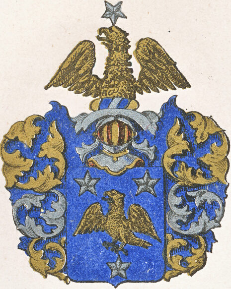 ”… Een blå Skiölldh, hwar uthi wijsar sigh en Örn af Gulldh medh hallf uthsträchte Wingar, emällan tränne FämbVddade Stiärner af Söllfwer, äfwen på Skiöllden een Öppen Tornerehiälm, hwar uthur upstijger öfra dehlen af en Gyllende Örn och öfwer deβ hufwudh een Stiärna af Söllfwer, Crantzen och löfwärket af Gulldh blått och Söllfwer hwart om annat mängt och fördehlt, alldehles som siellfwa wapnet medh sine egentelige Färgor på Fölliande Sijda representerat och afmåhlat står,…”