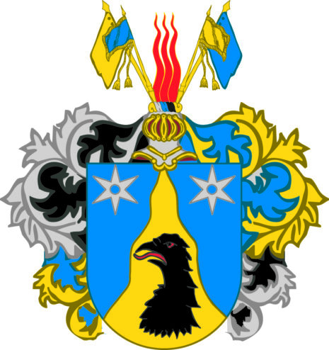 ”… En Skiöld genom twenne spitzigt upföre sammangående wågiga streck, fördelt i Trenne delar, warandes det medlersta feltet af Gull med ett swart Örnehufwud uti, och i hwardera af de begge yttre felten som äro blå, sees en molett af silfwer, ofwan på skiölden står en öpen tornerhielm, hwarutur upskiuta tre stycken flammuge röda strålar, emellan twenne fahnor och så många Estandarer med Gull och blått hwar om annan fördelte, Crantzen och Löfwärcket är af Gull, silfwer, blått och swart, aldeles som detta Wapen med deβ rätta färgor härhoos afmålat finnes.”
