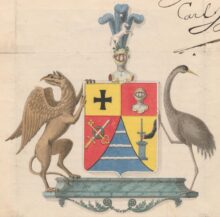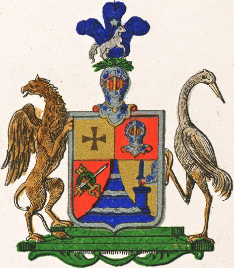 ”… En Fransk Skjöld, tvärdelad med en i två delar klufven Chef, i hvars högra fält, som är af gull, ses ett svart likbent Korss; men i det vänstra, som är rödt, en midt framåt stäld Hjelm af silfver. Skjöldens nedra del är klufven genom en af inböjda och till Skjöldkantens bägge nedersta hörn utsträckte lineer, formerad blå spits, hvari bjelkevis flyta tre smala strömmar af silfver. I högra Fältet, som är rödt, ses ett draget tvääggadt Swärd, med gyllene fäste, och en Nyckel af gull med upåt vändt ax, i korss lagde och midtpå växel-vis omfattade eller sammanhållne af en grön Lagerkrans. I vänstra Fältet som är af gull, framsträcker sig från Skjöldens vänstra kant, en svart stål-klädd höger-Arm, hållande uprätt ett blottadt tvääggadt Swärd på ett blått Altare. På Skjölden hvilar en öpen Tornerhjelm, på hvilken upreser sig en från höger till vänster i språng ställd hvit Häst, med en öfver den-samme sväfvande Nordstjerna af silfver, frammanföre tre blå Strussfjädrar, som nederst äro sammanknutne af en grön Ekelöfs-krans, hvilken tillika utgör hjelm-krans. Skjölden hålles å högra sidan af en ljus brun Grip, på bakfötterne uprest och med emellan dem framåt slagen swans, men bakåt sträckta wingar, samt å den vänstra af en Trana af naturlig färg; bägge med utåt vända hufvuden och stående på en Fotställning af mörk-grön Marmor, med derunder fästade Festoner af Björnklo-blad: Aldeles som detsamma med sina rätta och egenteliga Färger här afmåladt finnes.”