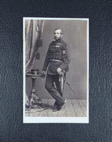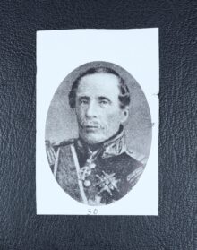 ”… En med en Spets nedifrån klufven Sköld, omgifven med en gyllene kant. I högra fältet, som är blått, synes en femuddig strålande Stjerna af guld, öfver hvilken tvänne gyllene Commandostafwar äro i kors lagde. I venstra fältet, som är rödt, synas Fem svarta Kulor, tre öfver och två underst. I medlersta fältet af guld visar sig en tillsluten Bok med svart penna, belagd med ett upprättstående Kors af silfver. På Skölden hvilar en öppen Tornerhjelm, beprydd med en af guld och blått virad Hjelmkrans, ifrån hvilken utgå tvänne åt sidorna lutande Infanterie-fanor och emellan dem synes ett upprättstående Infanterie-gevär. Skölden omgifves till halfva dess höjd af Löfverk, utantill af guld och innantill blått; aldeles såsom Wapnet här ofwan med sina rätta och egenteliga Färgor afmåladt finnes.”