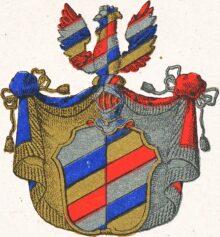 ”… En klufwen, och genom Fem Skuror ifrån Wanstra öfra till Högra nedra Skjöldkanten ginstyckad Skjöld, hwarigenom upkommer Tio smärre Ginbalckar eller Fäldt, de der, i anseende till Skjöldens Klyfning, wäxla Färgorna snedt öfwer på foljande sätt, nämligen till Höger, Silfwer, Blått, Guld, Rödt, Silfwer, och till Wänster, Guld, Rödt, Silfwer, Blått och Guld. Åfwan på Skjölden ses en öppen Tornerehielm hwaruppå hwilar en på lika sätt som Skjölden styckad oh Färgor wäxlande half Tupp med utsträckta Wingar. Hielm Krantsen är wriden af Silfwer, Guld, Blått och Rödt, och Wapentäcket är till Höger Blått Underfodrat af Guld, samt till Wänster Rödt underfodrat af Silfwer; Zirat och upbundit till Höger med Gyllende och till wänster med Silfwer Frantsar och Snören; Aldeles som det samma med sina egenteliga och rätta Färgor här bredewid afmålat finnes.”