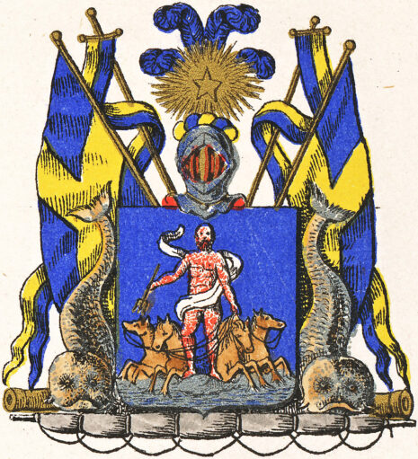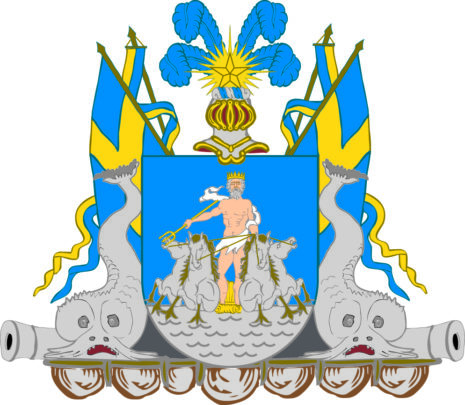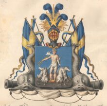 ”… En blå Sköld, hwaruti Neptunus med ett hwitt öfwer högra axeln och framför midjan fladdrande kläde, ses stående på sin Snäcka, hållande i högra handen och med utsträckt arm sin gyllene Treudd, spetsarne nedåt wända, samt i den wenstra tömmarna till sina fyra grå Sjöhästar, af hwilka twenne kasta sig åt hwardera sidan och alla, tillika med snäckan, flyta eller simma på silfwer-wågor. Ofwanpå skölden står en öppen Tornerhjelm, krönt med en af silfwer och blått sammanwriden Hjelmkrans, öfwer hwilken lyser en af gyllene strålar omgifwen femuddig Stjerna af guld, framför fyra blå Struszfjädrar, af hwilka twenne böja sig åt höger, twenne åt wenster, men de ytterste äro kortare och mera utåt lutande. I hwardera sidan åtföljes Skölden af en midt framåt wänd Delfin med upphöjd stjert, liggande utmed en utåt riktad Kanon; och bakom reser sig på hwar sida om hjelmen en Swensk utåt fladdrande Wimpel och en Swensk Örlogs-Flagg: Alltsammans hwilande på en så kallad Rå med beslaget eller hopdraget segel; Alldeles såsom detta Wapen här ofwan med sina rätta och egentliga färger afmåladt finnes.”
