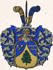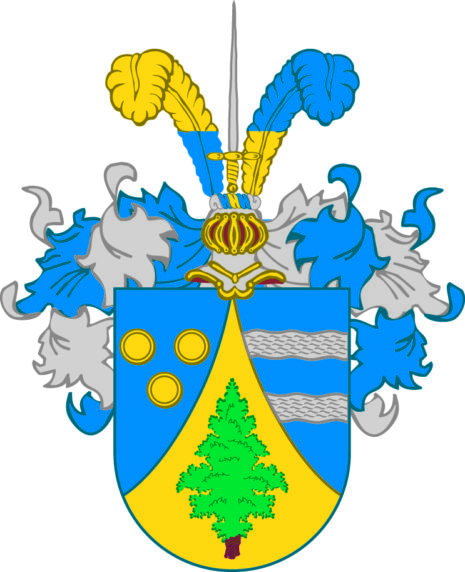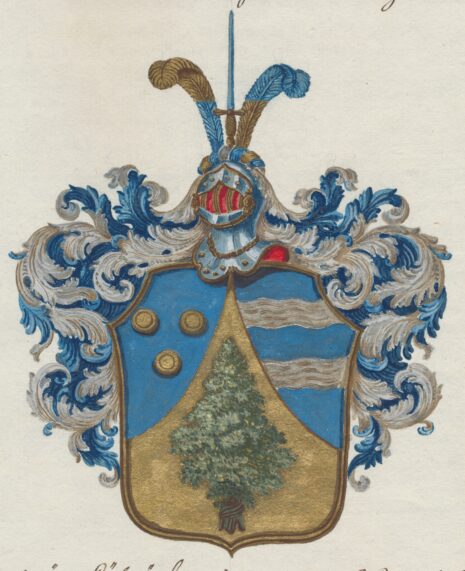 ”… En Skiöld, som ofwan ifrå(n) är Mantelskuren, hwaraf Formeras en upstående Spetz, som är af Guld, hw(ar) uti synes en sammanbunden Knippa af Grön Een. Det öfriga af (Sk)jölden är Blått, Hwaruti till Höger om Spetsen, Trenne Gyllende Penningar i förwänd Triangel lagde äro. Till Wänster, Twenne öfwer hwarandra flytande Stömmar af Silfwer. På Skjölden står en Öppen Tornerehjelm, Zirad med en af Guld, Silfwer och Blått wriden Hjelm Krants, hwaruppå Twenne, af Guld och Blått skiftade Strusz Fjädrar stälde äro, emellan hwilcka ett uprätt stående Swärd, Fästet af Guld, Klingan Blå, stäldt är. Löfwärcket är i grunden Blått och i dagen af Silfwer. Aldeles som det samma här med sina rätta och egenteliga Färgor här afmålat finnes.”