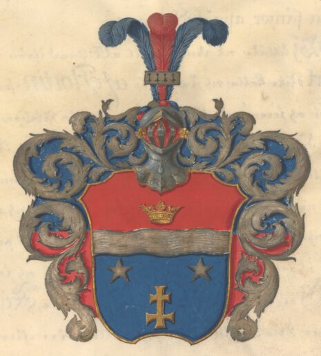 ”… En Sköld, öfwer hwilken, wid Twå tredje delar af dess högd, en Flod af Silfwer bjelkewis flyter. Den ofwanföre befinteliga Chefen är Röd, och förer en Gyldene Krona. Det nedanföre Floden warande fältet är Blått; och förekomma deruti Twenne Stjernor af Silfwer bjelkewis stälda, samt nederst midt öfwer Sköldens undra spets, ett Patriarchal Korss af Guld, uprättstående. Den Öpna Torner-Hjelmen är betäckt med en af Silfwer, blått och rött wriden HjelmKrants, hwarifrån upwäxa Trenne Strutz Fjädrar, de yttra eller utåtwände Blå, samt den medlersta Röd, belagde med en Silfwer bjelke, som är beströdd med Fyra äfwen bjelkewis satta Hermeliner. Hjelmtäcket, eller det så kallade Löfwerket är utwändigt af Silfwer, och inwändigt, til öfra delen Blått och till nedra Rödt; aldeles som det här dess rätta och egenteliga färgor afmåladt finnes.”