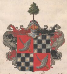 ”… En fyrdelt Sköld, hwars Första eller öfra Fält till höger är Rödt, uti hwilket en till höger wänd Arméens Flottas Sabel eller Huggare, Klingan af silfwer, samt Fästet af Guld, samt en till Wänster wänd Winge af Silfwer äro stälde uti twär-kors. Det Andra eller Öfra Fältet till Wänster består af Swarta och Silfwer Schack-Rutor Fyra i bredden och Fyra i högden. Det Tredje eller Nedra Fältet till Höger är i alt lika med det Andra och det Fjerde med det Första. Uppå Skölden står en öppen Torner-Hjelm, hwaruppå ett naturligt måladt Grönskande Träd sig wisar. Hjelm-Kransen är wriden af Silfwer, Swart och Rödt, och Löfwärket är i dagen af Silfwer, samt i grunden Rödt och Swart. Aldeles som detta Wapen med sin rätta Färgor här afmåladt finnes.”