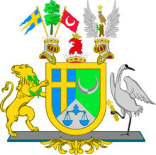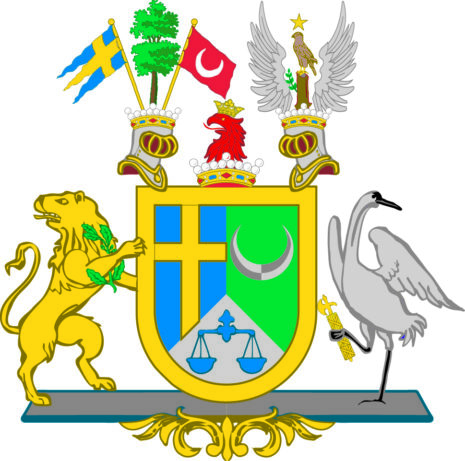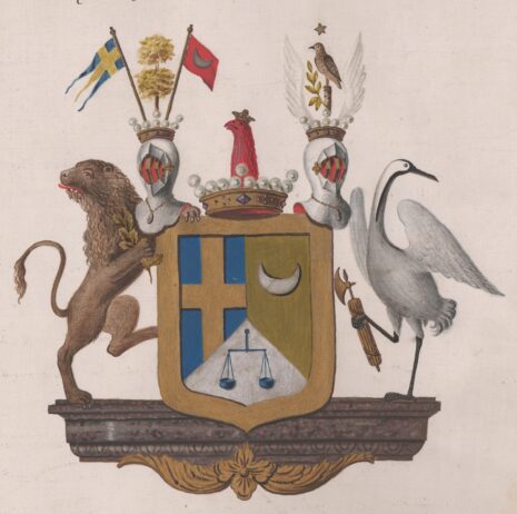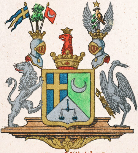 ”… En med gyllende Ram omgifwen Sköld, klufwen och widare genom en till hälften af desz höjd upgående Mantelskura, delad i trenne fält, af hwilka det öfra till höger, som är blått, är öfwerlagdt med ett gyllende Kors. I det wänstra deremot, som är grönt, synes en med spetsarne upåt wänd Halfmåne af silfwer; Och i det tredje eller Mantelsnitten, hwilket är af silfwer, ses en blå Wigt med jämt hängande balance och wigtskålar. Emellan twänne med Friherreliga Kronor betäckta öppna Tornerhjelmar står på Skölden en dylik Krona, hwarutur upreser sig ett rödt till höger wändt krönt Griphufwud, eller Skånes Sköldemärke. På högra Hjelmen wisar sig Ättens förra Hjelmprydnad: Ett twåkronigt grönt Eketräd emellan Swenska Örlogs Flaggan till höger samt en röd Turkisk Flagg till wänster, prydd med en Halfmåne af silfwer med upåt wända spetsar. På wänstra Hjelmen står emellan twänne utåt fläcktande hwita Wingar en trädstubbe, å hwars högra sida utspruckit en qwist med sju gröna blad, och uppå hwilken sitter en åt höger sig wridande Falk af naturlig färg, öfwer hwars hufwud lyser en femuddig gyllende Stjerna. Skölden hålles å högra sidan af ett Lejon med utåt wändt hufwud samt i högra Ramen hållande en grön Eklöfsqwist, och å den wänstra står en Trana med utåt böjdt hufwud och flaksande wingar, hållande i högra foten en så kallad Romersk Fascis af guld. Bägge stående på en undertill med gyllende ornamenter försedd Fotställning af Porfyr; aldeles som det med sina rätta och egenteliga färger här afmåladt finnes.”