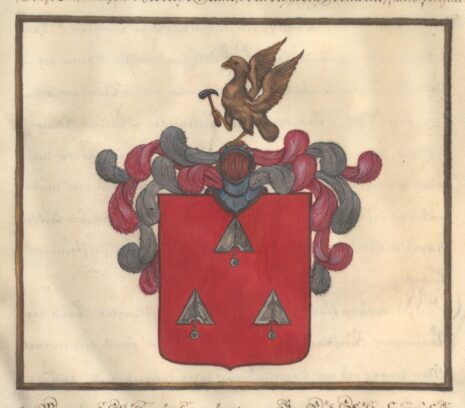 ”… En Röd Skjöld, hwaruti sees Trenne Wattupass af Silfwer, ett ofwan och Twenne inunder. Uppå Skjölden är en Öppen Tornere Hjelm, Zirad med en till Höger sig wändande Naturligt målad Örn, Hållande i Högra Kloen en Swart Smeds Hammare. Hjelm Crantzen är Wriden af Silfwer och Rödt, och Skjölden betäckes å båda sidor, i stället för Löfwärck, af Struss Fjädrar, som wäxelwis äro Röda och af Silfwer. Aldeles som det samma Här frammanföre med sina rätta Färgor afmålat finnes.”