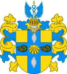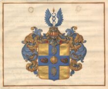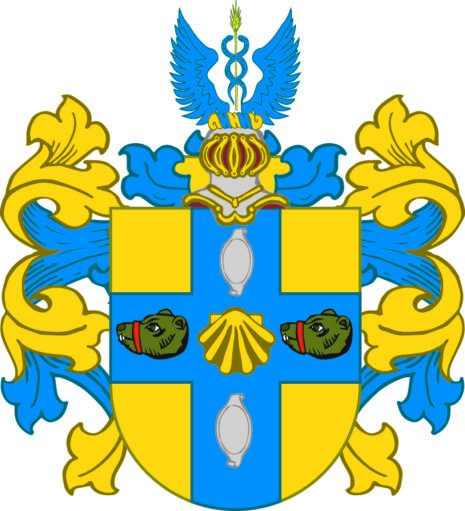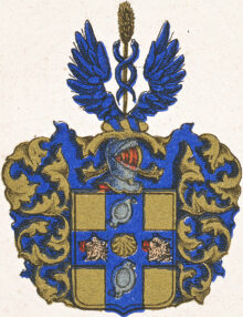 ”… En Skjöld af Guld, belagd alt in till Kanterne med ett Blått Kors, som till sin bredd swarar emot en Tredjedel af Skjölden: I Hiertat af Korβet förekommer en Muβla af Guld, åtfölgd af Twänne Naturliga, mot Höger wände, och med ett Rödt Band öfwer Nosen fängslade Biörnehufwuden, ett på hwardera sidan; jemväl en ofwan och en nedan inunder stäld aflång, något bruten, med fot- och hufwudstycke försedd Skjöld af Silfwer. Ofwan på Skjölden ses en Öpen Tornerehielm, hwaruppå emellan Twenne Blå utslagne Wingar upwäxer et Kornax af Guld, med Twenne blå deromkring sig slingrande Ormar. Hielm Krantsen är wriden af Guld och Blått, och det Skjölden omgifwande Löfwärcket är om hwart annat wridit med Blått och Guld. Aldeles som detta Wapn med sina rätta och egenteliga Färgor här bredwid afmålat finnes.”