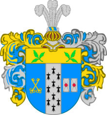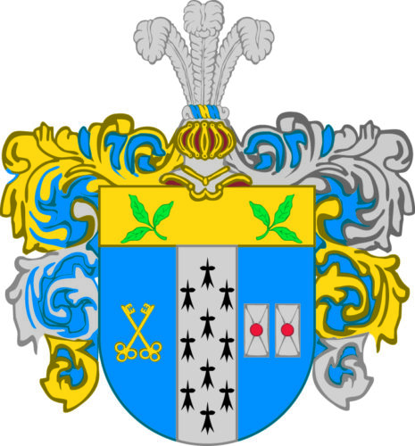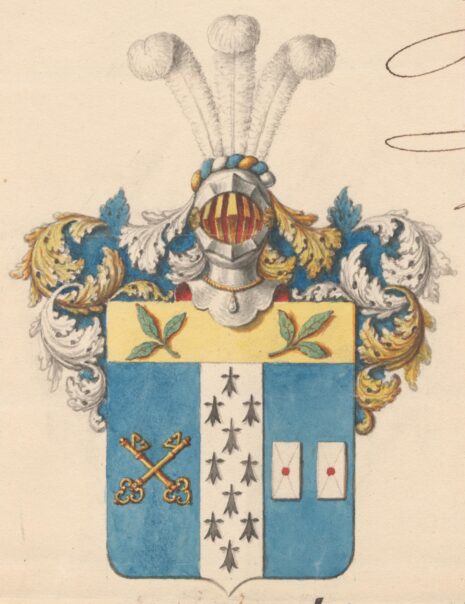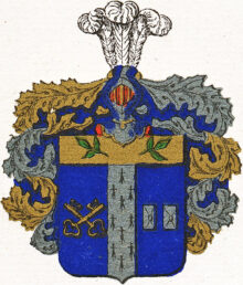 ”En Skjöld, belagd med en smal gyllene Chef eller Ginstam, hvaruti ses twänne i bredd liggande, åt hvar sin sida utåt lutande Lagerqvistar, hvardera innehållande trenne gröna blad. Nedanom den samma är Skjölden klufven i tre delar. I den medlersta, som är af Silfver och smalare än de andra, ses Tio swarta Hermelins-tecken, stolpevis så satte i förbund, att fyra af dem stå medlerst, och trenne till hvardera sidan. Bägge sido-fälten äro blå, och i det högra af dem twänne i kors lagde gyllene Nycklar, med sina så kallade ax uppåt och emot hvarandra wända; men i det wänstra Fältet twänne i bredd stälde förseglade Bref. På Skjölden hvilar en öppen Tornerhjelm, prydd med en af gull, silfver och blått sammanwriden HjelmKrans, hwaruppå stå trenne hvita Strussfjädrar. Skjölden omgifves upptill och till öfra hälften af Löfwärk, som utwändigt är wäxelwis af silfver och gull, men innantill blått.”