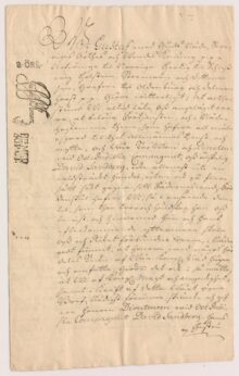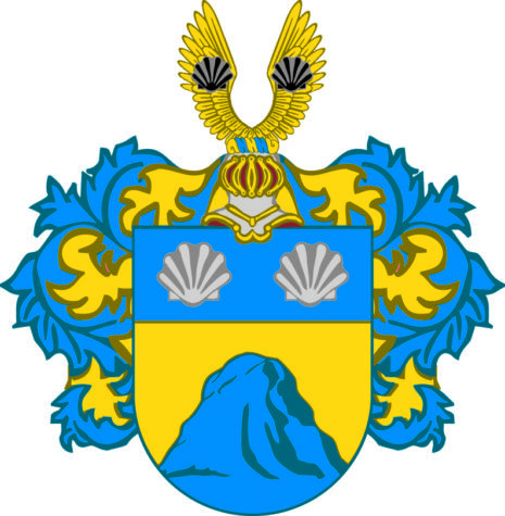 ”… En Gyllende Skiöld med en Blå Chef, hwaruti synas Twänne snäckor af silfwer, i bredd stäldte, och derunder uti det Gyllende Fältet är ett Blått Bärg. Utur den öpna Tornere hielmen, som står ofwanpå Skiölden, upstiga Twenne Gyllende Wingar belagde hwardera med En swart snäcka. Krantsen är wriden af Blått och Guld, och Löfwärket sammansatt af Guld och Blått. Aldeles som det samma här med sina rätta Färgor afmålat finnes.”