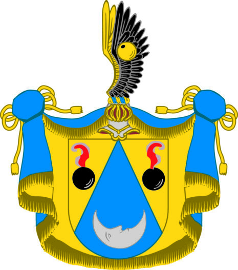 ”… En Skiöld af Guld, och theruti en ifrån bägge nedre Hörnen af Skiöldfoten up til öfra Skiöldkanten sammandragen blå Spets belagd, med en wäxande Halfmåne af Silfwer, och Spetsen beledsagad med Twänne Swarta brinnande Granater, en i hwarthera Öfra Hörnet af Skiölden. Ofwanuppå ses öpen Tornerehielm, och theruppå äro ställte 2ne Örneflygter, med utsträkte Fiedrar emot Wänster; men så på sidan, at then främre, som är swart och belagd med en ofyld Granat af Guld, til största delen borrtskymmer then Andra, som är af nysznämde Metall, så at allenast en smal rand framkommer på Högra sidan. Hielmkrantsen är wriden af Guld och Blått och Hielmtäcket är blått, underfordrat med Guld, Zirat och upbundit med Gyllende Frantsar och Snören. Aldeles som thetta Wapnet med sine rätte Färgor här ofwan afmålat finnes.”