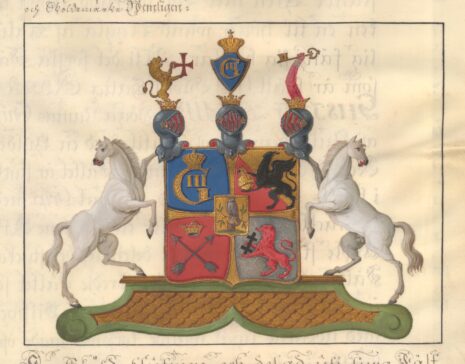 ”… En Sköld klufwen och delad uti fyra Fält, igenom ett smalt wid ändarne utrundat Korss af Guld, öfwer hwilket midt uti en Hjert-Sköld af Guld ligger, uti hwilken utur en på grön wall stående afbruten stam upwäxer ifrån den wänstra til den högra sidan en grönskande Gren med Löf beprydd, uppå hwilken en til höger wänd Uggla af Naturlig färg sig hwilar. Uti det första Fältet som är blått, ses Högst Salig Konung Gustaf Den IIIdjes Höga Namns Chiffre af Guld, beprydd ofwantil med en Gyldene Kongl: Krona. Det andra Fältet är styckat i hwars öfra del af Guld, en swart Grip med utsträckta wingar, håller ett Gyldene RiksÄpple stält i den andra delen af det styckade Fältet, som är röd. I det Tredje Fältet som är rödt, äro Twänne Dalpilar af Silfwer, med uddarne upåt wände korsswis lagde, öfwer hwilka imellan deras uddar, ses en Gyldene Krona. Det Fjerde Fältet är af Silfwer, där ett rödt til höger wändt Leijon håller i fötterne ett swart Patriarchal Korss. Ofwan uppå Skölden stå Trenne öpna Tornere-Hjelmar, hwardera betäckt med Grefwelig Krona af Guld. Uppå den medlersta Hjelmen hwilar en blå med Kongl: Krona betäckt Sköld, prydd med Högst Salig Konung Gustaf 3djes Höga Namns Chiffre. Ifrån den til höger stälda Hjelmen upstiger til hälften ett til wänster wändt Leijon af Guld, som emellan framfötterna håller ett rödt Korss; Och ifrån den på wänstra sidan stående Hjelmen upräcker sig en rödklädd arm, som med handen omfattar en nyckel af guld. Skölden hålles af twänne modiga hwita hästar. Aldeles såsom det här med sine rätta och egenteliga färgor afmålat finnes.”