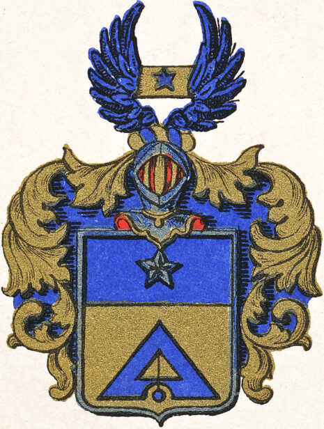 ”… En Sköld af Guld, ofvantil delad med en blå Chef, uti hvilken glindrar en femuddig Stjerna af Silfver. I den gyldene Skölden visar sig ett blått Watten-pass. Den öpna Hjelmen är betäckt med en af Guld och blått vriden Hjelmcrantz, hvarifrån upstiga tvänne blåa Vingar, emellan hvilka ligger en Gyldene Bjelke, belagd med en blå femuddig Stjerna. Löfverket är utvändigt af Gull och invändigt blått. Aldeles som det med sina rätta och egenteliga färgor här afmåladt finnes.”