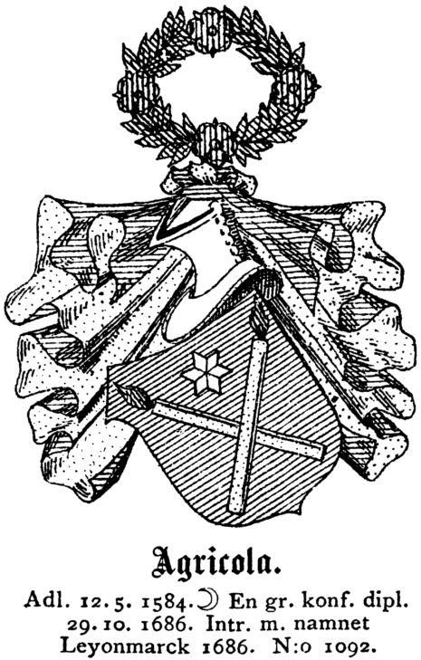 ”TvÃ¥ förgylda vaxljus i kors med en försilfrad sexuddig stjerna upp emellan ljusen uti blÃ¥tt fält; item en öppen tornerhjelm; kransen och hjelmtäcket blÃ¥tt och gult, derofvan appÃ¥ en örtekrans af ehrenprijs lika afdelt med fyra röda rosor.”