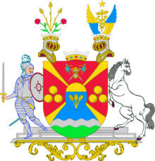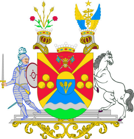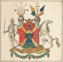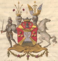 ”… En med ett Utbögt Gyllende S:t Andreæ Kors Fyrstyckad Skiöld, mitt på med En hiertskiöld belagd, hwilcken StamWapnet innefattar; Nämligen: Ett uti Twäran fördelt Fäldt, hwars öfre del, som giör en Trediedel af sielfwa Skiölden, är af Guld, och den Nedre Delen Blå, med Tre af ett Halm upstigande Gyllende Kornax. Första Fäldtet af Hufwudskiölden, som är Rödt, föreställer det af Nylands Dragone Regemente i desz Estandarer förande Södra Finlands Wapn, En med Crona betäckter Hielm af Silfwer, under hwilcken Twenne blå med Gyllende Kors märckte Estandarer i korswis äro lagde. Det Andra och mitt inunder warande Fäldtet är med en Silfwerström delat, hwaraf den Öfre delen blå och den Nedra grön synes, och Utwisar det bemälte GeneralMajor i Nåder, wid gräntse Commissionen emellan Cronorne Swerige och Ryszland, updragne giöromål. Det Tredie och Fierde Fäldtet är Rödt, och förekomma uti bägge desze Tre gyllende Kulor, 1: och 2: stäldte till betecknande af de för Friedrichssteens Fästning undfångne blessürer. Ofwan på Skiölden stå Twå krönte och emot hwarannan wände Hielmar, samt emellan dem en Friherrlig Crona. Utur den första upstiga Tre gyllende Kornax, som med twenne Röde Wallmog omgifne äro. Och Uppå den Andra ses Twenne Wingar med Guld och blått om hwarannan i twäran fördelte, warande emellan dem Mercurii Staf af Guld, hwaröfwer en Femuddig Stierna af samma Metall swäfwar, som är en del af det Adeliga Göthenstierniska, General Majorens afledna Makas Wapn. Skiöldhållare äro: På den högra sidan den Norrske Staden Friedrichshalls Märcke, en med Pantsar och Hielm beklädd, samt med dragen Wärja i den ena, och Skiöld i den andra handen, bewäpnad Man: Uppå den wänstra åter en sig tilbaka seende modig hwit Häst. Aldeles som det samma här hos till alle delar afmålat finnes.”