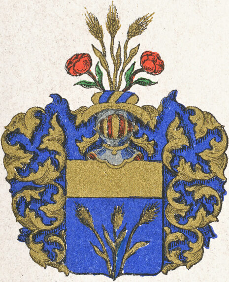 … en uti twerran fördeeld skiöldh, hwar öfre dheet som giörer tredie deelen af heela skiölden ähr af Guldh af dhen undre deelen blåå med tree af ett halm upstijgande gyllene Kornax; ofwan på Skiöldhen en open Adeligh Tornerehielm, uthur hwilcken upstijga emillan twå rödha Wallmoy, tree gyllene Kornax, Crantzen medh Löfwercket af Guldh och Blåå färga; aldeles som dhet härhooß med sine egentelige färgor afmåhlat ähr….