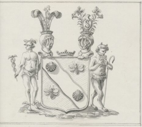 ”… En Purpur Skjöld hvaröfver en vågig Ström af Silfver bande-vis flyter, belagd öfverst och nederst med en Svart Mussla, men sidosatt af tvänne upåt surrande Bj af Guld. Ofvan på Skjölden stå tvänne med Fri-Herre Kronor Krönte öpne Tornere Hjelmar, emellan hvilka en större Fri-Herre Krona uppå sjelfva Skjölden hvilar. Uppå den Högra Hjelmen ses en gyllende uråldrig Herde Staf med grön Lager omvefvad, emellan tvänne Struss Fjädrar till hälften af Guld och Svart afskurne tvärt emot hvarandre skiftande: Och uppå den vänstra Hjelmen ses en rundad Antique Silfver Skjöld hvarutinnan förekommer ett S, af blå färg, som är framledne Directeurens af Ost-Jndiska Compagniet samt Commendeurens af Kongl.Wasa-Orden Niclas Sahlgrens Namns Chiffre, varandes samma Skjöld å hvardera sidan åtfölgd af ett Stånd utaf den efter Cancellie Rådet Alströmer upkallade och af honom upfundna vackra Örten Alströmeria, blomman blekröd med brun och röd Schatering samt grön stjelck och blader. Skjöldhållare äro till höger en Mercurius hållande i högra handen en gyllende Caducée, samt till vänster Skogsguden Pan, spelande på sin af rör samman satte Skogs Pipa, samt hållande i handen sin Herde-Staf: bägge lika som Skjölden stående på en grönskande marck. Aldeles såsom det här frammanföre med sina rätta Färgor afmålat finnes.”