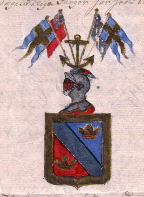 ”… En Skiöld igenom en Silfwer Bande fördelt i twenne delar, warandes det öfra fältet blåt och det nedra röt, uti hwardera fältet lyser en gyllende Crona, rundt om kring Skiölden löper en Bord af gull. Åfwan på Skiölden är en öppen Tornerhielm, hwar uppå står et gyllende Anckar emellan Twenne Swänska Cron-Flaggor, samt en Engelsk och Fransök flagga. Crantzen och Löfwärcket är af gull, silfwer, blåt och rödt. Aldeles som sielfwa wapnet med deβ egenteliga färgor här hos målat utwisar.”