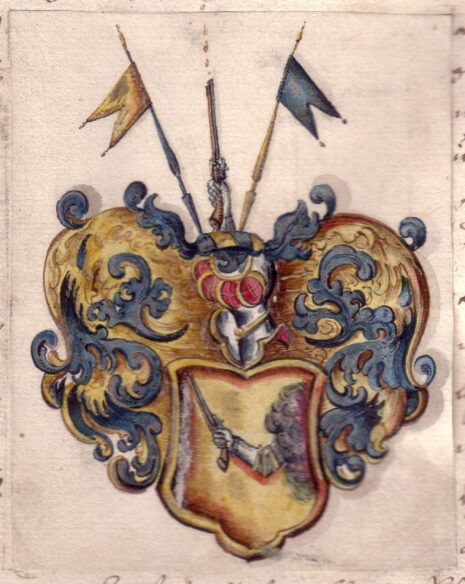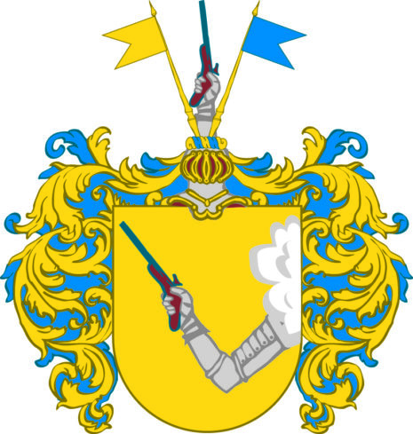 ”… Een gul Sköldh, der uthi een Vthstreckt Arm, medh een Pistol i handen; Ofwan opå Skölden een öpen Tornere hiälm, Crantzen och hiälmtecket medh blåt och gult fördeelt, der ofwan opå een Arm hållandeβ j handen opret een Pistol, emillan twenne Standarer eller Phanor, den eena blå och den andra guul; Effter som siälfwe Wapnet her hoos medh sijne egandtlige färgor repræsenterat och affmåhlat ståår; …”