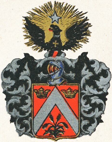”. . . En Röd Skiöld, hwarutinnan stÃ¥r en Silfwer Sparre, sidosatt ofwantill af Twenne Guld-Cronor, och inunder ifrÃ¥n Skiöldens foth upwäxer ett Gyllene RÃ¥g-StÃ¥nd, hwaraf de Twenne medlerste Axen skiuta sig rätt upÃ¥t, men bägge sidoskotts axen böija sig hwarthera Ã¥ sin sida utÃ¥t. Ofwan uppÃ¥ Skiölden stÃ¥r en Öpen Tornerhielm med en af Silfwer och Swart ihopflätad Hielm Crantz beprydd, hwarutur upwäxer Öfwerdehlen af en i Flycht stäld Swart Örn, med Silfwer Halsband och ett därwid fästat pÃ¥ Bröstet hängande Gyllene Patté-Kors zijrad, men öfwer Hufwudet glindrar en Silfwer-Stierna, hwars gyllene StrÃ¥hlar sig rundt omkring sprida. Löfwärket är af Silfwer och Swart: aldeles som detta wapnet, med sine rätta färgor, härbredewid afmÃ¥hlat finnes.”