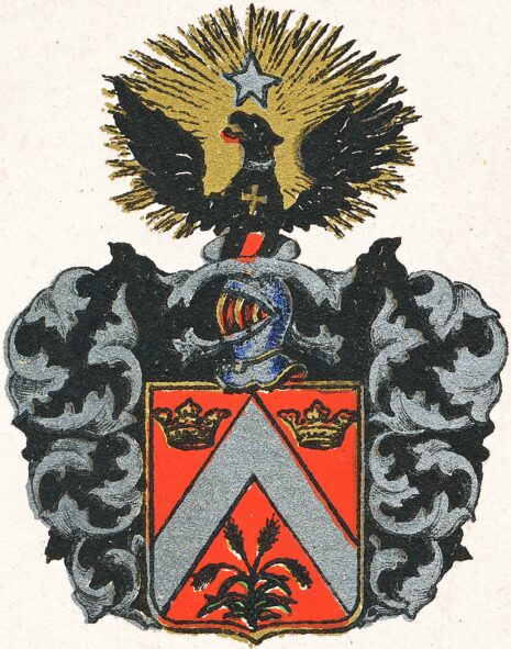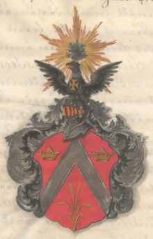 ”. . . En Röd Skiöld, hwarutinnan står en Silfwer Sparre, sidosatt ofwantill af Twenne Guld-Cronor, och inunder ifrån Skiöldens foth upwäxer ett Gyllene Råg-Stånd, hwaraf de Twenne medlerste Axen skiuta sig rätt upåt, men bägge sidoskotts axen böija sig hwarthera å sin sida utåt. Ofwan uppå Skiölden står en Öpen Tornerhielm med en af Silfwer och Swart ihopflätad Hielm Crantz beprydd, hwarutur upwäxer Öfwerdehlen af en i Flycht stäld Swart Örn, med Silfwer Halsband och ett därwid fästat på Bröstet hängande Gyllene Patté-Kors zijrad, men öfwer Hufwudet glindrar en Silfwer-Stierna, hwars gyllene Stråhlar sig rundt omkring sprida. Löfwärket är af Silfwer och Swart: aldeles som detta wapnet, med sine rätta färgor, härbredewid afmåhlat finnes.”