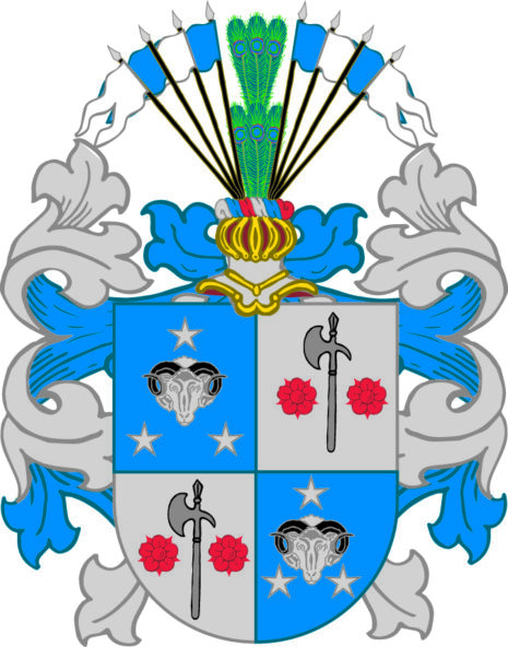 ”… Skiöld fördeelt, hwilkens högres öfwerst och Wenstres Nederdeelen ähr blå, och der vthj är ett hwitt Baggehufwudh, emellan twenne stiernor, i den wenstres Öfwer och högres nedre deel af Skiölden ähr hwijt, och vthj hwardere een Hellepardh, med twenne Röde Roser: Ofwan på Skiölden een öpen Tornerehielm, Crantzen och Hielmtecket medh ……fördeelt på hielmen opstå otta Phanor, fyra hwijta och fyra blå, hwilka Zieras med sex emellan satte Påfoglefiedrar, aldeles som sielfwe wapnet, här mitt oppå, med sine egentlige fergor repræsenterar och afmåhlat ståår …”