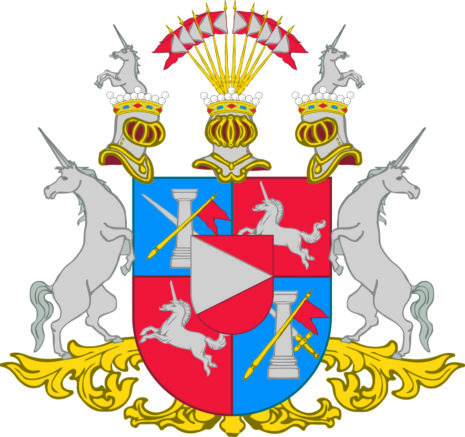 ”… En fyradubbel fördeelt sköldh, der mitt uthi dheras förre vapn, som är ett fält, der uthi ett hvitt fiäll uthi en trehörnigh form. Den öfverste skölden på högre och nederste på vänstre sijdan en stodh eller pelare, der bredevidh stå i korssvijs ett bart sverdh och en rödh standar uthi blått fält. Uthi den öfverste skölden på vänstre och nederste på högre sijdan, hvilke äre rödhe, står en enhörningh uthi fult språng. Ofvan på skölden tre öpne tornerehielmar, täcket rödt. Hvardera hielmen medh en frijherre chrona opå, och uthur dhen midleste hielm chronan opstå tolf fahnor medh hvijt och rödh färga fördeelte. Opå dhen högre så väl som den vänstre hielmchronan står en enhörningh medh uthsträcht tunga, aldeles som sielfve detta vapn medh sine egäntlige färgor här hoos afmåhlat och repraesenterat står. . . .”