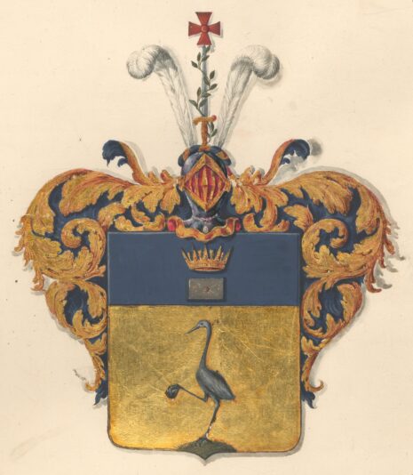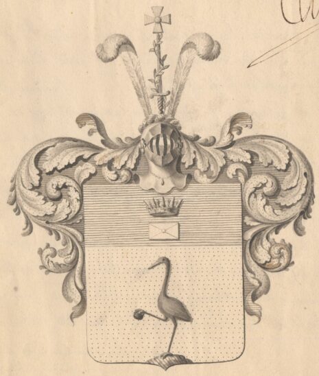 ”… En Fransk Sköld, twerdelad till en blå Chef, uti hwilken ses en Swensk Hertiglig Krona af guld, hwarunder ligger ett försegladt Bref af silfwer. I nedra fältet, som är af guld, står på spetsen af ett grönt berg, en till höger wänd Trana af naturlig färg, hållande i sin högra upplyftade fot en swart Sten. Ofwanpå skölden är en öppen Tornerhjelm, uti hwars af guld och blått sammanwridna Hjelmkrans är upprest ett med gyllene fäste försedt Swärd af stål, omlindadt med en grön Lagerqwist och bärande på sin spets ett rödt Ordenskors samt stående emellan twenne hwita Struszfjädrar. Löfwerket, som omgifwer Skölden, är utwändigt af guld, undertill blått; Alldeles såsom detta Wapen här med sina rätta och egentliga färger afmåladt finnes.”