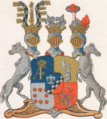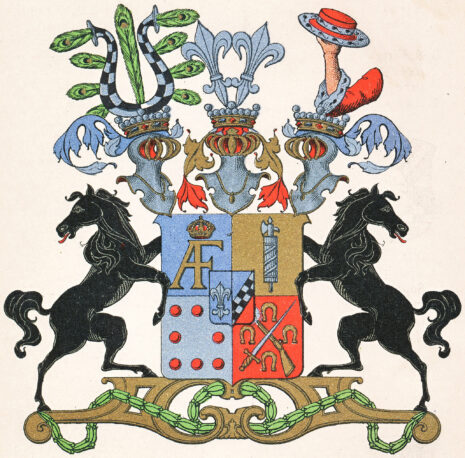 ”… En fyrdelad Skiöld, mitt uppå belagd med en Hiertskjöld, som uti ett Klufwit Fäldt innehåller, först, till Höger det Adeliga Beckiska Stam wapnet, nemligen en Fransk uprättstående Lilja af Silfwer uti blått Fält, och för det Andra till Wänster, det Adeliga Friesiska Stamwapnet ifrån Danmarck, hwaruti en Barre, öfwerlagd med Twå Rader Schack rutor af Silfwer och Swart, gienstyckar Fältet, ofwan i blått och nedan i Rödt. Men af FriHerre Fälterne är det Öfra Högra Fältet blått, hwaruti förekommer Wårt Namn i Chiffer, och deröfwer en sluten Kongl. Krona, begge af Guld. Det Andra Öfra Fältet till Wenster af Guld, innehåller en uprättstående Blå Romersk Fascis. Det Tredie eller Nedra Fältet till Höger, innehåller det Stahl von Holstenska Stam wapnet Otta Röde Kulor i Silfwerfält, som med sin ställning utgöra en fullkomlig Fyrkant eller Tre på hwarje Sida. Det Fierde och Sidsta Fältet till Wänster är Rödt, hwaruti förekommer en bandewis stäld afloszande Carbin, Korszwis öfwerlagd med ett Twehändigt Swärd, Fästet af Guld och Klingan af Silfwer, samt beledsagad Öfwer, under och å Begge Sidorne af Fyra Hästeskor af Guld. Ofwan på Skiölden stå Trenne Öpne och med Friherrlige Kronor krönte Tornere Hielmar. Uppå den Medlersta Hielm Kronan Beckiska Wapnets Hielmprydnad, Twenne ifrån hwarannan utlutande, och till mer än Hälften upstigande Fransyske Lilljor af Silfwer. Uppå den Högra Kronan står Friesiska Hielmprydnaden, nemligen emellan Twenne Buffel Horn en uprättstående Grön Gullsprängd Påfågels fieder, Hornen öfwer alt belagde med Silfwer och Swarte Schack Rutor, samt hwardera på Utsidan Zirade med Fyra stycken Bielckewis stälde Gröne Gullsprängde Påfogels Fiedrar. Och uppå den Wänstra Kronan af den nu tillagde Hielmen, hwilar en emot Höger wänd Arm med purpur klädnad och Hermelins Bräm, som på Handen förer en Purpur och Hermelins brämad Råds Hatt. Sidst äro Skiöldhållare Twenne sig tilbaka seende modige Rappar eller Swarta Hästar. Aldeles som detta Wapn med sine rätta och egentelige Färgor Här ofwan afmålat finnes.”