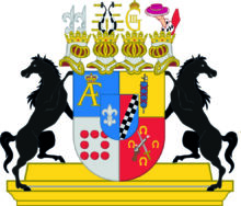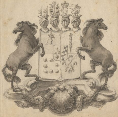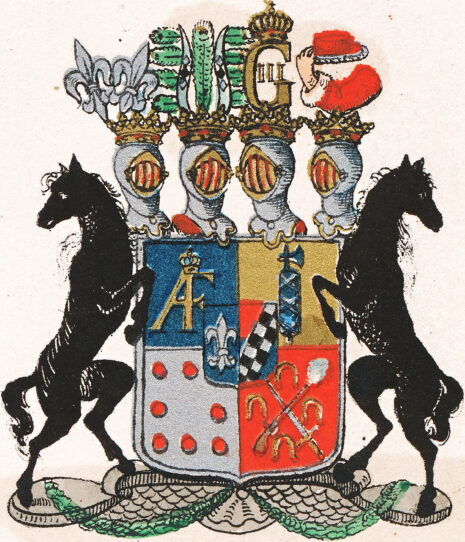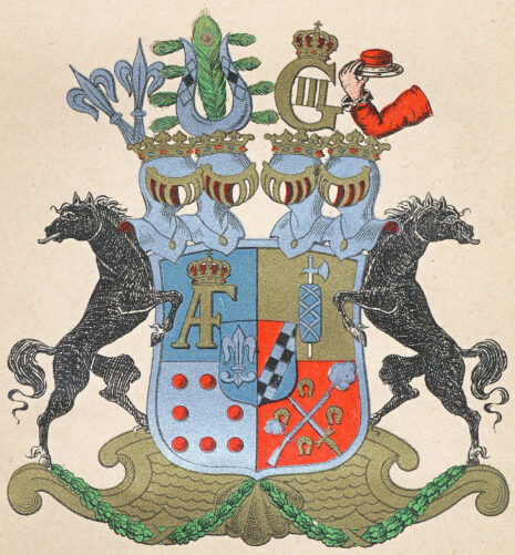 ”… En Skjöld korsswis i fyra delar, mitt på fördelningen belagd med det förra Adeliga Beckfriisiska Wapnet, som är en i längden klufwen Skjöld, Fältet till höger är blått, hwaruti synes en fristående Fransk eller Heraldisk Lilja af Silfwer, hwilket egenteligen är det Beckiska Wapnet; Det wänstra Fältet är en barre af swarta och Silfwer wäxlande Schack rutor sju i längden, och twå i bredden, warandes färgen ofwanföre röd och under blå, hwilket är egenteligen det Friisiska Wapnet; af sjelfwa Grefwe Wapnet är det första fältet blått, hwaruti synes ett med en Gyllende Krona täckt AF af Guld, det andra fältet är Guld, hwaruti ses en emot höger wänd fasies romana, hwars yxa är stål, men knippet blått med hwita bindlar, det tredje Fältet är Herr Grefwens framledne Grefwinnas eller det Friherrliga Stael von Holsteinska Wapnet, som är i Silfwer fält Åtta röda kulor, ikring Fältets bräddar 3, 2 och 3 stälte; det fjerde fältet, herr Grefwens Möderne, eller det Adeliga Skogiska Wapnet, är rödt, hwaruti en bandewis med mynningen upåt wänd pistol, som skiutes lös, så at eld och rök ses utur pipan och fängpannan, bane wis belagd med ett blottadt swärd, åtfölde ofwan, nedan och på sidorne af fyra häst skor af järn; Hela Skjölden är Zirad af fyra med Grefwe Kronor prydde Hjelmar; utur den första från höger räknad, upstiga twänne utåt lutande Heraldiska Lilljor af Silfwer, som är det Beckiska Wapnets Hjelm prydnad; Den andra Hjelmen tilhörer det Frisiska Wapnet, hwarutur resa sig twenne af swarta och hwita Schack rutor öfwerlagde buffel horn, hwardera på yttra sidan späckad med fyra Påfogle fjädrars spetsar samt emellan dem en uprest dylik stjert fjäder; ofwanpå den tredje Hjelmen synes ett med en Konglig krona täckt Gyllene G III; Uppå den fjerde Hjelmen synes en mot höger wänd på armbogen sig stödjande hög arm, klädd i Råds talarden, hållandes på handen en med Purpur Sammet öfwerdragen och med Hermelin bebrämad Riks Råds hatt; Skjöldhållare äro till höger och wänster en tilbaka seende swart modig häst, hwilandes sig altsammans på en med bildhuggeri Zirad Gyllene Piedestal.”