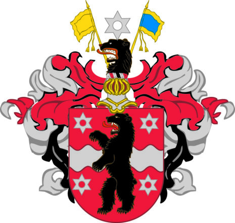 ”En svart opprättstÃ¥ende björn mellan fyra moletter af silfver uti en röd sköld, som är midt pÃ¥ trären afskuren med en flytande ström af silfver. PÃ¥ skölden en öppen tornerhjelm och der uppÃ¥ ett svart björnhufvud med öppet gap och öfver hufvudet en molett af silfver emellan tvÃ¥ estandarer; det högra af guld, det venstra af blÃ¥ färg; kransen och löfverket af silfver, rödt och svart, hvarom annan fördelta.”
