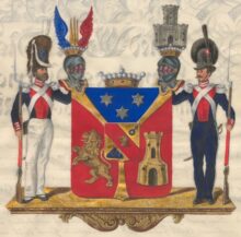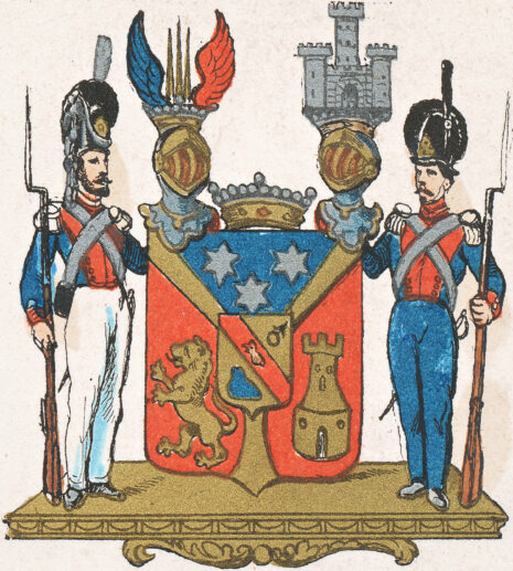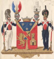 ”… En rätt uppstående fransysk sköld, belagd med ett åt ändarne utböjt pythagoriskt gyllene korsz, midtpå hwilket är fästadt ättens adliga wapen: en gyllene sköld, som är styckad af en röd balk, midtpå prydd med ett åt höger wändt, gyllene Griphufwud med utsträckt tunga; warande i öfra fältet ett swart jernets eller Martis tecken och i det nedra ett fritt stående blått berg. I Friherre-sköldens öfwersta fält; som är blått, tindra trenne sexuddiga stjernor af silfwer, satte twå och en. I det högra, som är rödt, synes ett på bakfötterna upprest, till höger gående gyllene Lejon; och i det wenstra, likaledes rödt, ett gyllene, upptill creneleradt fästningstorn, som å sin nedra del eger en hwälfd, swart port mellan twänne runda, swarta styckegluggar, och på den öfre, uppåt smalnade delen, under twänne dylika, i bredd satte gluggar, ett aflångt, hwälft, swart fönster. På skölden står en Friherrlig krona emellan twänne med sådane kronor täckte, till det yttre af stål i naturlig färg och till det inre röda, öppna tornerhjelmar, af hwilka den högra wisar ättens adliga hjelmprydnad, som är: trenne rätt uppåt stigande gyllene strålar, emellan twänne uppåt sträckte, utspände wingar, den högra blå, den wenstra röd. På den andra hjelmen ses ett större fästningstorn i twänne afsatser, på sidorne hwarom äro sammanbyggde twänne mindre sådane, alla tre i silfwer och upptill crenelerade. Å det medlersta tornets nedra del synes en swart, hwälfd port, omgifwen på hwardera sidan af en swart, rund skottglugg; samt i midten å den öfre delen trenne öfwer hwarandra satte, likadana gluggar; på sidorne om hwilka sex dylika äro antydde. Skölden upprätthålles af twänne soldater utaf Konungens Andra Lif-garde, af hwilka den till höger är klädd till parad i blå frack med röda uppslag å bröst, krage och armar, swart patronkök och huggare i hwita gehäng, som öfwer bröstet äro lagde i korss, hwita epauletter, hwita underkläder och damasker, swarta skor, samt en med hwit uppstående plym, banderolle och plåt med det krönta Swea-wapen, prydd Grenadiermössa; hållande med högra handen gewäret för fot. Den till wenster stående bär klädsel till waktgöring af blå frack med röda uppslag å bröst, krage och armar, blå underkläder med hwita lister, swarta damasker och skor, swart kask med liggare och uppstående plym, wid hwars fäste ses compagnie-märket, en hwit halfmåne i rödt fält, och synes framtill å kasken en gyllene plåt, derå finnes Götha-wapnets krönta sköld. Gewäret, som han med wenstra handen håller för fot, samt öfrige munderingspersedlar äro lika med den högra sköldhållarens. Wapenskölden är stående på en prydlig fotställning af guld; aldeles som det med sina rätta och egentliga färger här afmåladt finnes.”