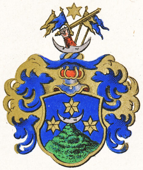 ”… Skiölden blå der vti ett gröndt bergh, ståendhe vnder een half måna medh tre guula stiernor der omkringh offwan oppå Skiölden een öpen Tornerhielm täckedh och Crantzen medh guult och blåt fördeelte offwan oppå hielmen i lijka måtto een half måna vtur hwilken een bewäpnadh arm sigh sträcker emillan fyra fahnår Hafwandes i handen ett baart Swärdh vnder een guul stierna aldeles såsom dedh medh sine rätte färgor her representerat och afmålat finnes …”
