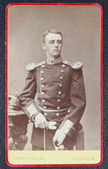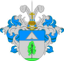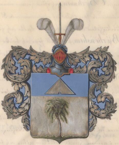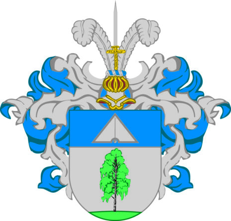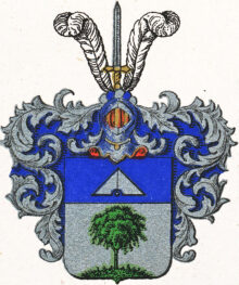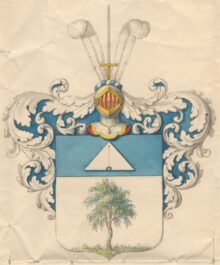 ”… En Sköld, delad genom en blå Ginstam, hvaruti ses ett jämt stäldt Watten-Pass af silfver. I nedra Fältet, som är af silfver, står ett grönskande Björkträd på en gräs-beväxt Marck. Ofvanpå Skölden hvilar en öppen Tornerhjelm, prydd med en af silfver och blått sammanwriden hjelmkrans, på hvilken, imellan tvänne åt hvar sin sida utåt lutande hvita Strussfjädrar, ses ett uprätt, och med Spetsen upåt, blottadt Swärd, med gyllene fäste. Skölden omgifves af Löfwerk, som i dagen är af silfver, men i grunden blått. Alldeles som detsamma här med sina rätta Färger afmåladt finnes.”