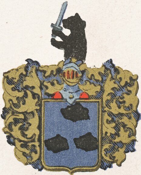 ”… Trij Biörn Huffvdht Vthi ett blått fiäldh ofwan på Hielmen een half oprest Biörn, hafwandhes vthi den ene Ramen ett Swerdh, och vthi den andra ett blått lodh, Hielmteckedt och krantzen fördelt medh blådt och gåldt, aldeles medh det medh sine egendtlige färgor här afmåhladt står.”
