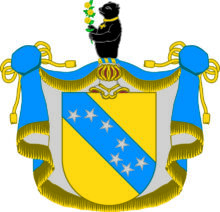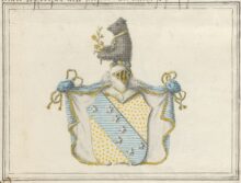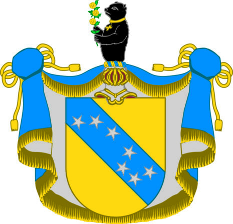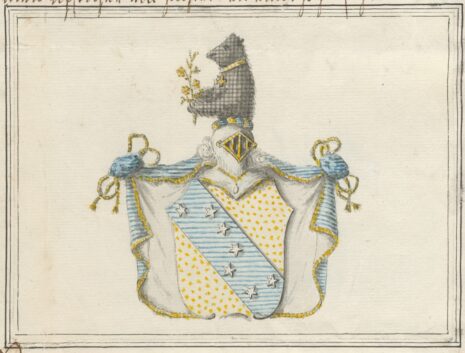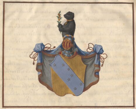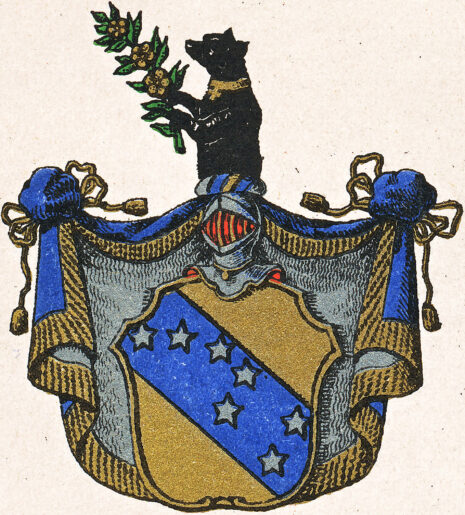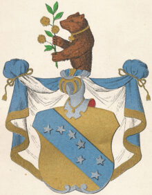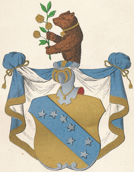 ”… En Gyllende Skiöld, hwaröfwer går en bred och emot Skiöldens högd till en Trediedel swarande Blå Bande som är belagd med Constellationen Ursa Major eller den så kallade Karla Wagnen, och består af Sju Lysande Fem Uddige Stiernor af Silfwer. Ofwan på den Öpne Tornere Hielmen upstiger till Hälften en emot Höger sig wändande Swart Björn som med en Ring omkring Halsen, af guld, är omgifwen och hwarwid ett Kors af Guld hänger, förande emellan Ramarne Orten Celsia, som består af Trenne Fembladige och uppå en Lång grön uprättstående Stielcke anwuxne Rosor af Guld: Krantsen är af Guld och Blått, och Wapentäcket är blått till den Yttra, men af Silfwer till den Inre sidan. Aldeles som samma Wapen med sina rätta och egenteliga Färgor Härhos afmålat finnes.”