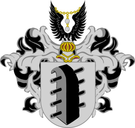 ”… en hwijt sköldh, der vthi en Stormstega medh swart och grå färga, offuan oppå Skölden en öpen Tornerehielm, Täcket och krantzen medh hwijt och swart fördeelte, offuan på hielmen Tw länkelodh hiängiande på en förgylt Jernkedhia emellan twenne Swarta wingar, aldeles som dhet her hoos medh sine egentlige färgor affmåhlat står.”