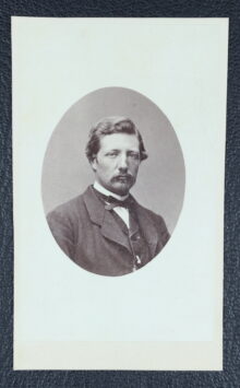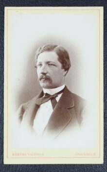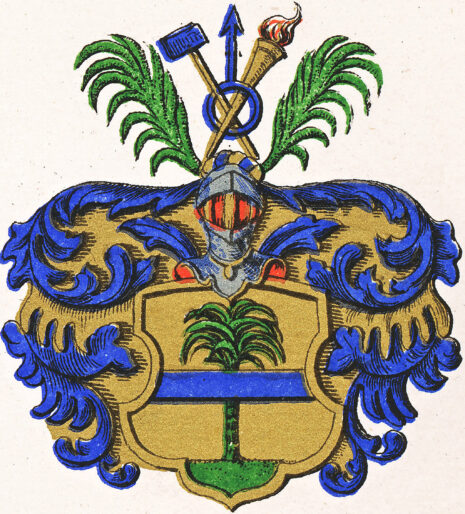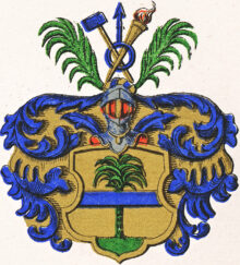 ”. . . En rätt uppstående, af en ram utaf guld omgifven tysk sköld af guld, från hvars fot, som är grön, uppskjuter till sköldens hela höjd ett grönskande palmträd i naturliga färger, och öfver hvilket är lagd en skölden delande blå bjelke. På skölden hvilar en, nertill med guldskoning försedd öppen tregalrad tornerhjelm, som till det inre är röd och till det yttre har naturlig stålfärg. Omkring dess hals synes en riddarekedja af guld med dervid hängande gyldene smycke. På hjelmen hvilar en af blått och guld virad hjelmkrans, hvarifrån uppstiga tvänne palmqvistar, emellan hvilka synas korslagda och mot hjelmkransen sig stödjande en blå slägga med skaft af guld samt en brinnande fackla med handtag likaledes af guld, bägge i korset uppbärande jernets med spetsen uppåt sträckte blå märke. Från hjelmen utgår, sträckande sig utåt sköldens bägge sidokanter löfverket, som till det yttre är blått och till det inre är af guld. Aldeles som sköldemärket med sina rätta och egentliga färger här afmåladt finnes. . . .”