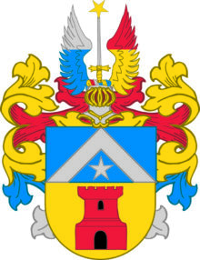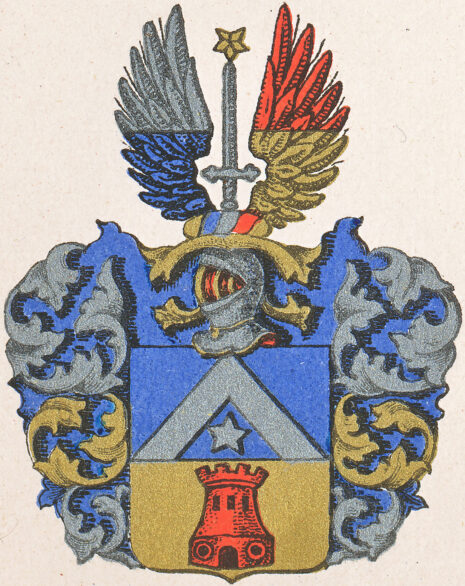”… Ett Skiöldemärke, hwilket i twäran fördelas i twänne lijka Fält; Hwaraf det Öfre är Blått, och hafwer utj sig een försilfrad Sparre, och under den samma en Stierna af Silfwer; och det nedre af Gull med en Röd Borg der utj; Men Öfwer sig wisar det samma een Öppen Tornerhielm, hwaruppå sees en bahr Wärja med en gullstierna på Spetzen, emellan twänne utslagne och i twäran fördelte Wingar, den högre af silfwer och blått, och den wänstre af Rödt och gull; warandes Crantzen och Löfwärket af gull, silfwer, blått och Rödt, aldeles som det här hos till alla des dehlar afmåhlat finnes.”