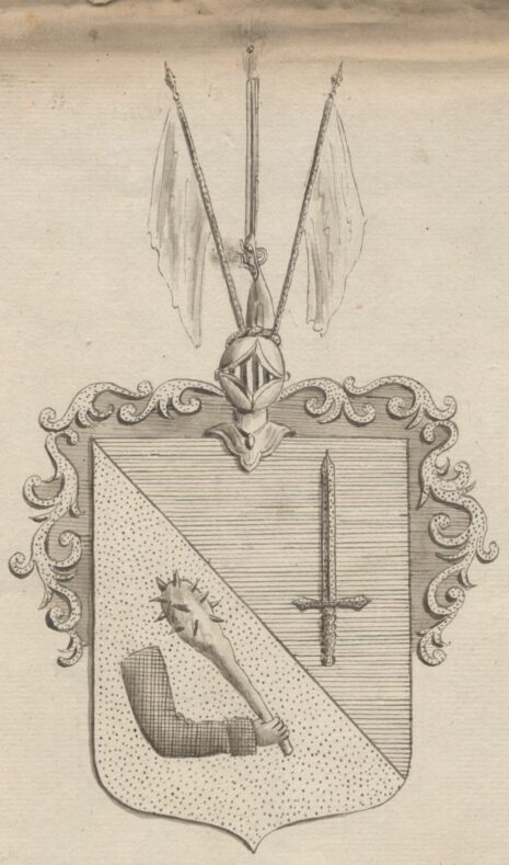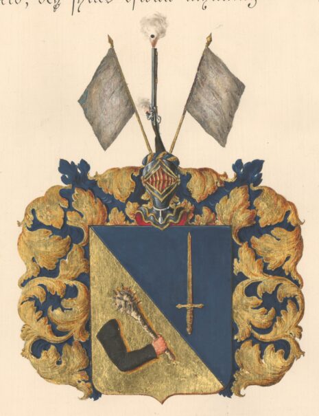 ”… En ifrån högra öfra till nedra wenstra hörnet styckad Sköld, i hwars öfra fält, som är blått, står ett lodrätt med spetsen uppåt wändt gyllene swärd, och i det nedra, som är af guld, wisar sig en swartklädd högerarm, som swänger en spikklubba af naturlig färg. Den öppna Tornerehjelmen är betäckt med en af guld och blått wriden hjelmkrans, hwaröfwer swäfwa twenne hwita Fanor på gyllene stänger, emellan hwilka är upprest en med mynningen uppwänd studsare af naturlig färg, som gifwer eld, och synes ofwan mynningen den utskutna kulan. Hjelmtäcket eller Löfwerket är innantill blått och utantill af guld; Alldeles såsom detta Wapen här ofwan med sina rätta och egentliga färger afmåladt finnes.”