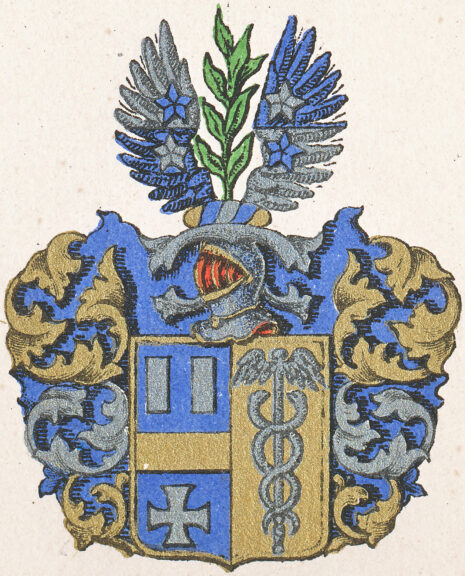 ”… En Skiöld i längden fördelt i twänne lika dehlar, warandes det högre fältet blått, hwaruti ligger en gyllende Bielcke, öfver den samma sees twänne billetter af Silfwer och under Bielcken ett Kors af samma Metall, det wänstra fältet är af Guld, med en blå Mercurii Staf uti; Ofvan på Skiölden står en öppen Tornerhielm, hwarutur upstiger en grön Lager qwist emellan twänne utslagne och i twäran med Silfwer och blått hwar om annan fördehlte Wingar, hwardere af Wingarne är Zirad med twänne Stiernor, som skifta sig emot metallen och färgen; Crantzen och Löfwärket är af Gull, Silfwer och Blott, aldeles som detta Wapn med sina egentlige färgor här brede wijd på andra sidan finnes afmåhlat.”