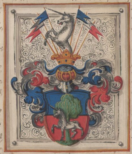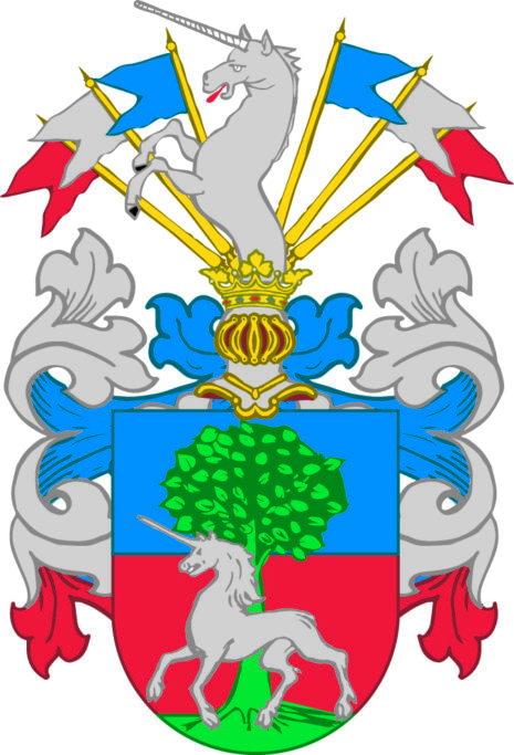 ”… Een fördeelt Sköldh, den öfre deelen blå och den andre rödh, deruthj står Een Eenhorn af hvijt färga wi dh een grön Lindh, Ofuan opå Skölden Een öpen Torneerhielm, Täcket och Crantzen medh blått, rödt och huijtt fördeelte och bekrönte; Der ofuan opå står Een halff opräckt Eenhorn, emellan sex fahnor aff blå, röde och hvijte färgor; Aldeles som det medh sine egendtlige färgor härhoos afmåhlat och repræsenterat står; …”