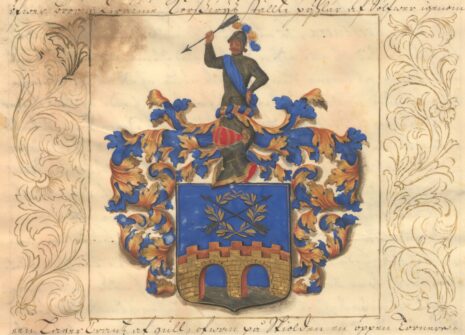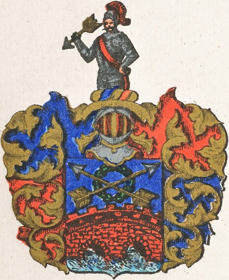 ”… och är samma Skiöld och Wapn Blå, der uthj en broo af Gull, Liggiandes öfwer en Sölfwer färgat Ström, öfwer broon Twänne Korβwijs ställte pijhlar af Sölfwer igenom een Lager Crantz af gull, ofwan på Skiölden en öppen Tornerhielm, hwar uthur uppstiger öfre dehlen af en bewäpnadt Man med ett blått fält teckn beprydd, hållandes en pijhl i högre handen, Crantzen och Löfwärket är af gull och blått, aldehles som sielfwa Wapnet med sine rätte och egentelige färgor här hoos repræsenterat och afmåhlat står.”