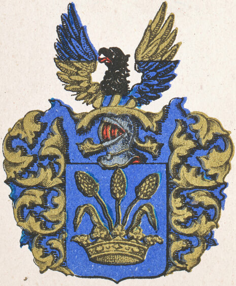 ”… En Skiöld af Blå Färg, hwar uti sees en Gyllende Crona, uhr hwilcken upstiga trenne stycken Hweet Ax af Gull med twänne des Blader af samma Metall. Åfwan på Skiölden står en öppen Tonerhielm, hwar uthur sträcker sig ett Örnehufwud med Halsen, af Naturlig Färg, emellan twänne uthslagne Wingar af Blått och Gull, hwarom annan i twären fördehlte. Crantzen och Löfwärcket är af Gull och Blått, aldeles, som detta Wapen med sine egenteliga färgor här hoos afmåhlat finnes.”